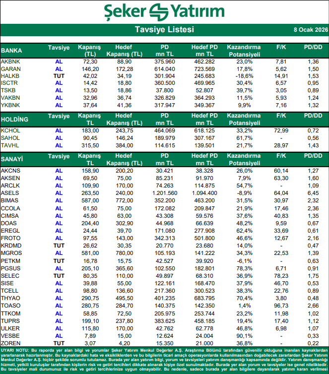 Kaynak: Şeker Yatırım Tavsiye Listesi