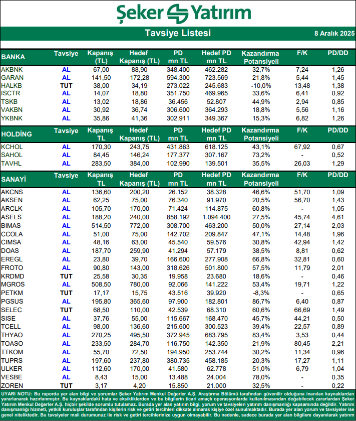 Kaynak: Şeker Yatırım Tavsiye Listesi