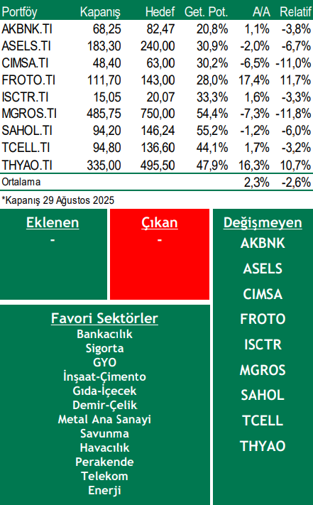 Temmuz toplantısıyla birlikte faiz indirim döngüsüne giren TCMB’nin, enflasyondaki gerilemeye paralel olarak eylül ayı da dahil olmak üzere kalan toplantılarda faiz indirimlerine devam etmesini bekliyoruz. KKM’nin sonlandırılması, Borsa İstanbul’da açığa satış yasağının kaldırılmasının planlanması ve Eylül ayının ilk haftasında açıklanması beklenen üç yıllık Orta Vadeli Plan’ın piyasalarda olumlu etki yapmasını bekliyoruz. Ayrıca, Trump baskısı altında kalan Fed’in Eylül toplantısında faiz indirimlerine başlaması ve barış görüşmeleri için adımlar atılan Rusya-Ukrayna savaşından pozitif haberler gelmesi ile gelişmekte olan ülkelere yönelecek fon akımları ve petrol fiyatlarındaki gerileme de TL varlıkları olumlu etkileyecektir.