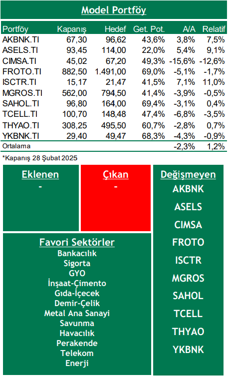 Bu değerlendirmeler ışığında BIST 100 Endeksi için 12 aylık 15.000 puan olan hedefimizi ve hedef değerimizin cari endekse göre %55 getiri potansiyeli taşıması nedeniyle AL önerimizi koruyoruz. MSCI Turkey endeksi 2025T 6.67x ve 0.87x F/K ve PD/DD oranları ile EM MSCI endeksine göre 45,5% ve 46,6% iskontolu işlem görmektedir. Bu ay model portföyümüzde değişikliğe gitmiyoruz.
