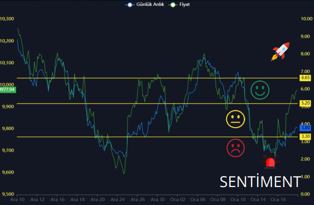 Sentiment kritik seviyeler: Aşağıda 3.30 ve 2.40 ; yukarıda ise 5.20 ve 6.65 2.40’dan başlayan son yukarı hareketlenmeden sonra tekrar 3.30 altını görmek istemeyiz.