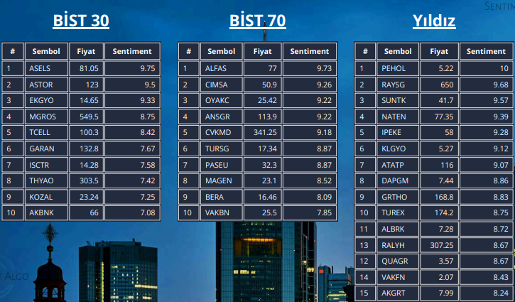Bu raporda yer alan her türlü bilgi, değerlendirme, yorum, istatistiki şekil ve bilgiler hazırlandığı tarih itibari ile mevcut piyasa koşulları ve güvenirliğine inanılan kaynaklardan Sentiment Algo sistemi verileri elde edilerek derlenmiştir ve Zephlex Bilgi Teknolojileri, Eğitim ve Danışmanlık A.Ş tarafından genel bilgilendirme amacı ile hazırlanmıştır. Sunulan bilgilerin doğruluğu ve bunların yatırım kararlarına uygunluğu tarafımızca garanti edilmemektedir. Bu bilgiler belli bir getirinin sağlanmasına yönelik olarak verilmemekte olup alım-satım kararını destekleyebilecek yeterli bilgiler burada bulunmayabilir. Herhangi bir yatırım aracının alım-satım önerisi ya da getiri vaadi olarak yorumlanmamalıdır. Bu görüşler mali durumunuz ile risk ve getiri tercihlerinize uygun olmayabilir. Sadece burada yer alan bilgilere dayanarak yatırım kararı verilmesi beklentilerinize uygun sonuçlar doğurmayabilir. Bu nedenle bu sayfalarda yer alan bilgilerdeki hatalardan eksikliklerden ya da bu bilgilere dayanılarak yapılan işlemlerden, yorum ve bilgilerin kullanılmasından doğacak her türlü maddi/manevi zararlardan ve her ne şekilde olursa olsun üçüncü kişilerin uğrayabileceği her türlü doğrudan ve/veya dolaylı zararlardan dolayı Zephlex Bilgi Teknolojileri, Eğitim ve Danışmanlık A.Ş ile bağlı kuruluşları, çalışanları, yöneticileri ve ortakları sorumlu tutulamaz. Burada yer alan yatırım bilgi, yorum ve tavsiyeleri yatırım danışmanlığı kapsamında değildir.