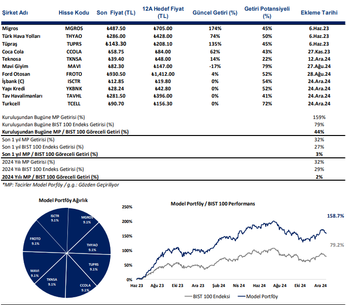 2025’e girerken gözden geçirdiğimiz ve yeniden dizayn ettiğimiz Model Portföyümüze İş Bankası, Yapı Kredi Bankası, TAV Havalimanları ve Turkcell’i eklerken; Lider Faktoring’i Model Portföyden çıkartıyoruz. Türk Hava Yolları, Coca Cola İçecek, Ford Otomotiv, Mavi Giyim, Migros, Teknosa ve Tüpraş ise Model Portföyümüzde kalmaya devam ediyorlar. Model Portföyümüzde yer alan şirketleri ve performanslarını bu raporumuzla beraber eşit ağırlıklı olarak takip edeceğimizi de ayrıca belirtmek isteriz.