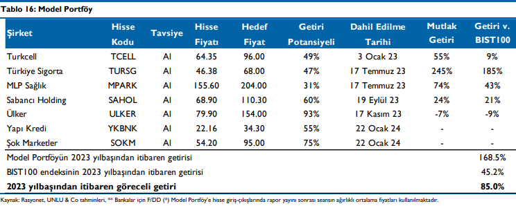 Coca-Cola İçecek’i model portföyümüzden çıkarırken Yapı Kredi ve Şok Marketleri ekliyoruz. Böylece model portföyümüzün içeriğini Turkcell, Türkiye Sigorta, MLP Sağlık, Sabancı Holding, Ülker, Yapı Kredi ve Şok Marketler oluşturuyor.