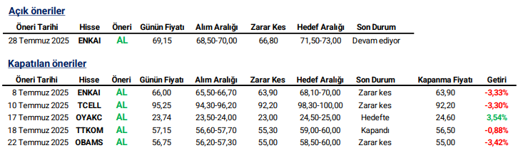 Günlük Hisse Önerileri