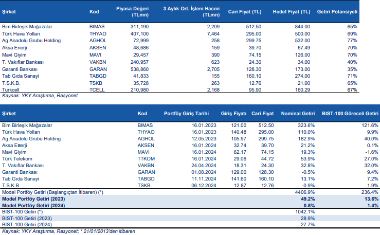  Yüksek enflasyonla başa çıkabilen (fiyatlama gücü olan) finansalları yüksek faiz ve değerli TL’den faydalanan, net işletme sermaye ihtiyacı ve borçluluğu düşük şirketleri önceliklerimiz ışığında oluşturduğumuz Model Portföyümüz TTKOM’un yerine TCELL’i eklememiz sonrası: BIMAS, THYAO, AGHOL, AKSEN, MAVI, VAKBN, GARAN, TABGD, TSKB, TCELL hisselerinden oluşmaktadır.