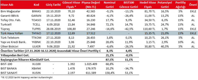 Türk Hava Yolları (THYAO): Pandemi döneminde endeksin gerisinde kalan havacılık sektörü hisselerinin, aşı ile birlikte normalleşme dönemine girecek olması beklentisi ile hisse öneri portföyümüze ekliyoruz.