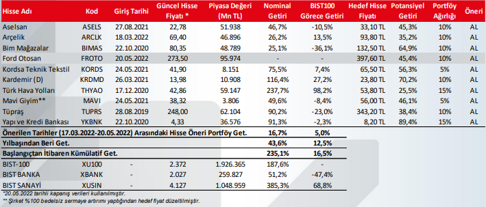  Ford Otosan (FROTO): Güçlü ihracat gelirleri öngörüsüyle olumlu 2022 tahminlerine ek olarak, elektrikli araçlara dönüşümdeki önemli pozisyonu ve yeni yatırımın önümüzdeki dönemde sağlayacağı büyüme ivmesi beklentilerine bağlı olarak Ford Otosan’ı öneri portföyümüze ekliyoruz.