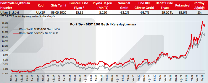  Ülker (ULKER): Hisse ile ilgili «AL» önerimizi korumakla birlikte, portföye eklediğimiz tarihten itibaren nominal -%32,2, BIST100 görece – %68,7 kayıp kaydeden ULKER hisselerini, Önem Gıda’nın alınması sonrası artan borç ve döviz açık pozisyonunu bağlı oluşan baskının devam etmesi nedeniyle öneri portföyümüzden çıkartıyoruz.